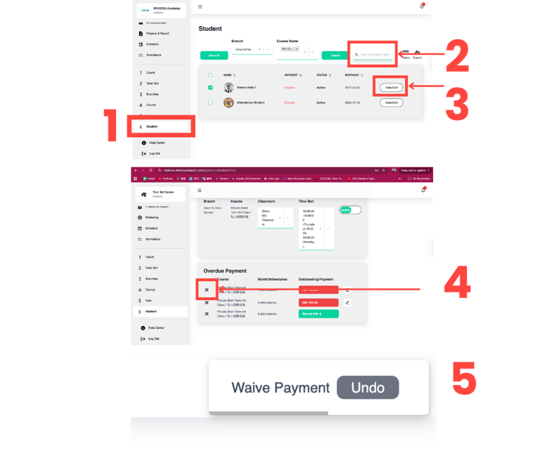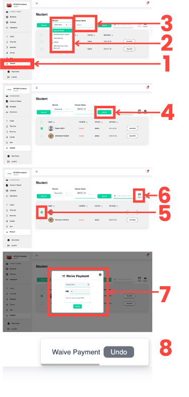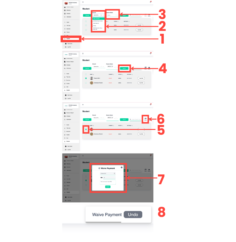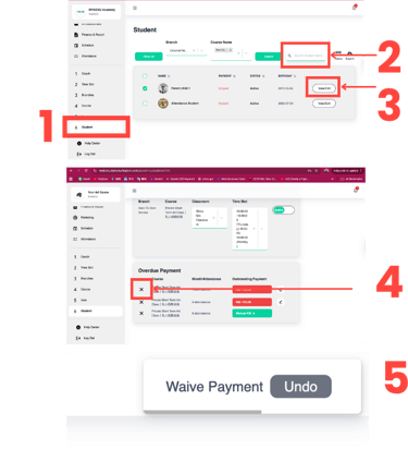 5. If there is a mistake, please click the right corner "undo" within 15 seconds (otherwise the waived amount can not be canceled).
